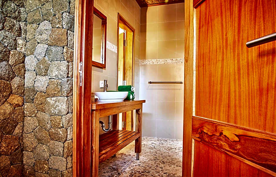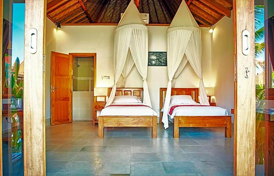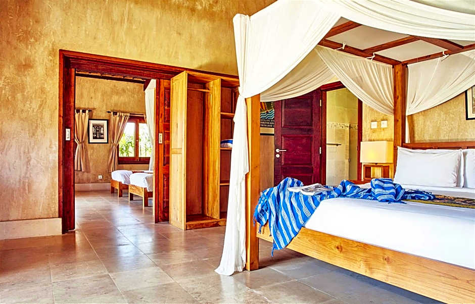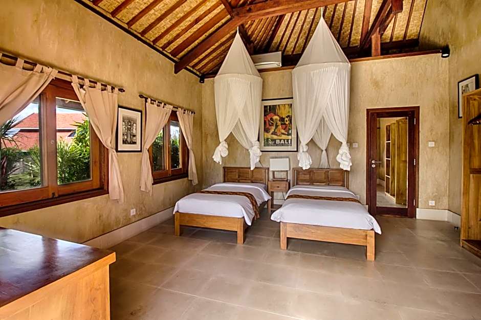 A fully air conditioned villa featuring a spacious seating area, an private bathroom and several spots for sun bathing. Views of the garden and the swimming pool can be enjoyed from the villa.