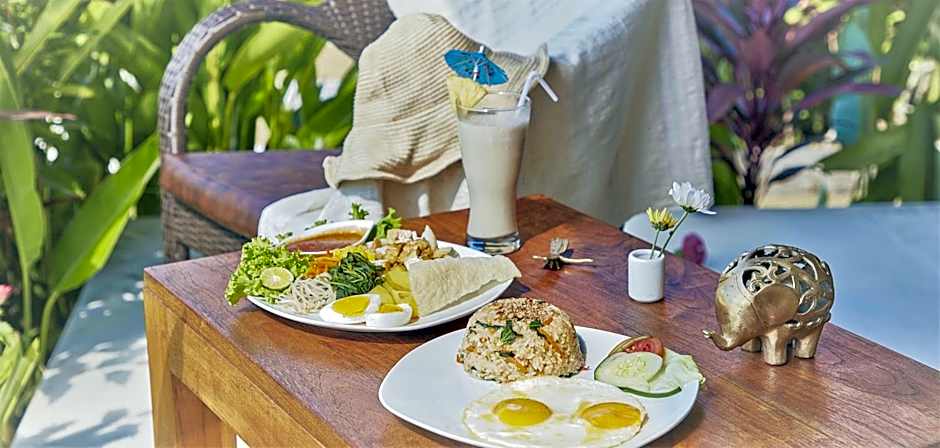 A fully air conditioned villa featuring a spacious seating area, an private bathroom and several spots for sun bathing. Views of the garden and the swimming pool can be enjoyed from the villa.